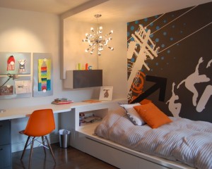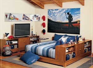 Как только ребенок становится подростком, у него к этому моменту вырабатываются конкретные взгляды на жизнь, он уже общается с группами лиц, которые, по его убеждению, подходят именно ему, и поэтому, выбирая дизайн комнаты для мальчика-подростка, нужно считаться с его мыслями и пожеланиями. Вот на примере этого фото, дизайн детской комнаты для мальчика-подростка можно обустроить по такой тематике.