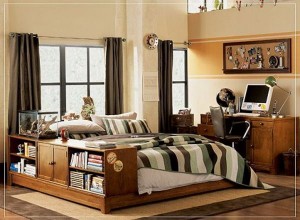 Длинная комната не должна смущать будущего мужчину. В ней необходимо удобно расположить все необходимые предметы, детали и мелочи. Всё должно быть доступно и под рукой. Побольше ящиков, этажерок и полок.