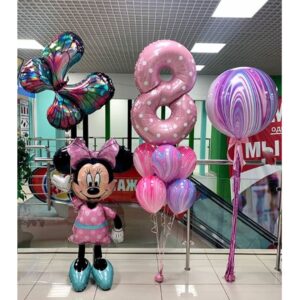 Отдельно стоит упомянуть комплекты, в которых все перечисленные варианты объединяют в яркие композиции, способные впечатлить даже взрослого человека. Одна из таких — «Долгожданный праздник», состоящая из ходячих шаров Минни и Микки, фольгированной цифры и 25 разноцветных шариков в горохи (горошек является цветовой «темой» мультика). Такой сет будет отлично смотреться в качестве фотозоны в кафе во время празднования и в качестве утреннего сюрприза имениннику или имениннице.