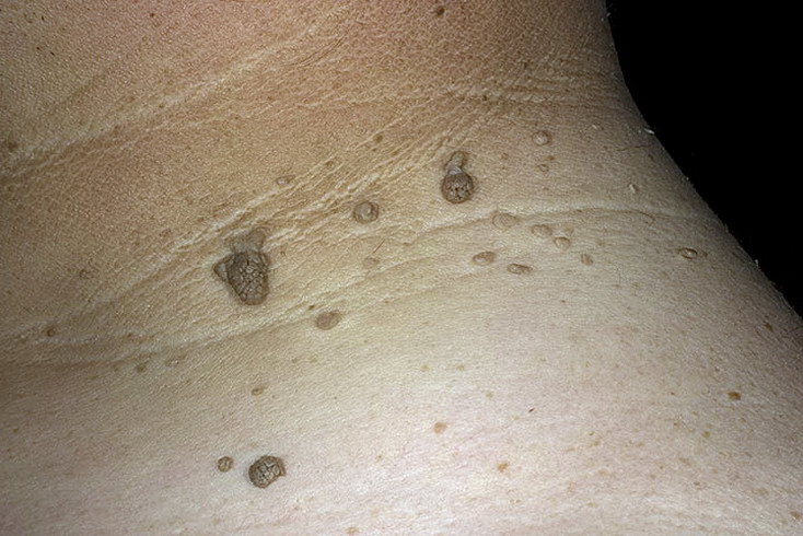 - Множественные образования в виде папиллом и бородавок на различных частях тела.