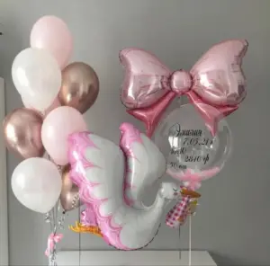 - Гелиевые шары: выглядят «воздушно», «плавающе» и плавно поднимаются над полом. Хороши для фото у входа и на выходе из роддома.